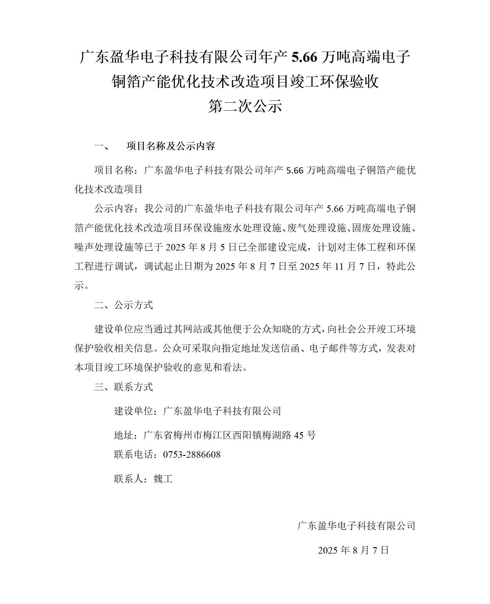 廣東盈華電子科技有限公司年產(chǎn)5.66萬噸高端電子銅箔產(chǎn)能優(yōu)化技術(shù)改造項(xiàng)目竣工環(huán)保驗(yàn)收第二次公示